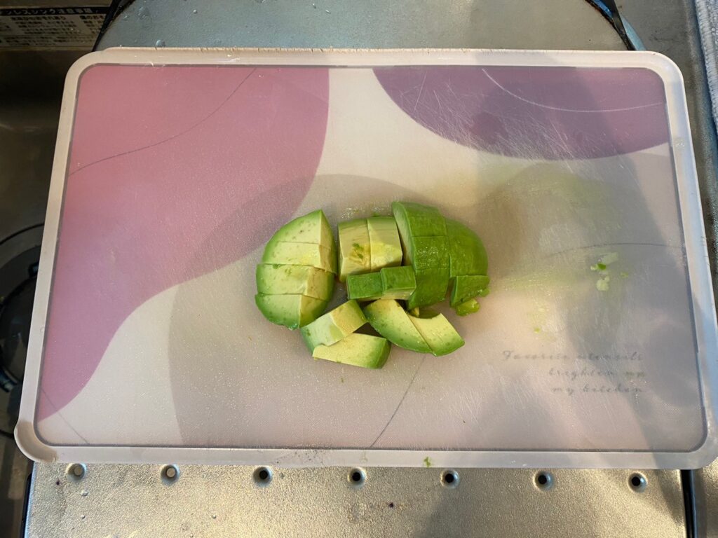 ⑥アボカドを角切りにする。