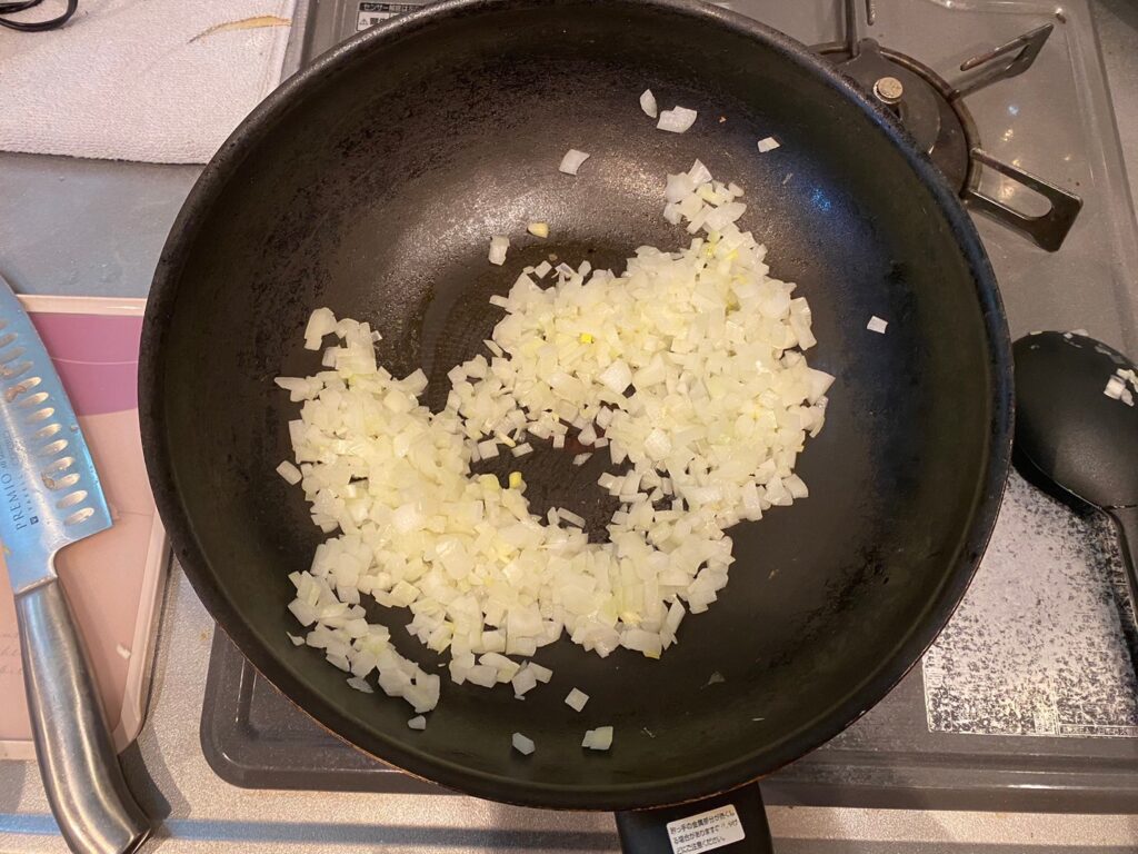 ③玉ねぎを飴色になるまで焼く。